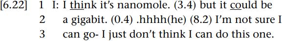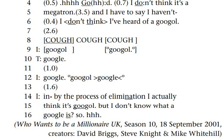 Following Ingram’s articulation of googol as a possible although unlikely response (lines 5–6), there was noticeably marked coughing in the audience (line 8). Immediately following this Ingram started repeating googol (lines 9 and 12), eventually coming to the conclusion that the answer was googol (lines 14–15), which indeed it was. It turned out that the wife had agreed to signal an answer as correct through coughing after it was listed by Ingram. By doing so they had exploited the power of sequential placement of a seemingly meaningless cough to convey a particular meaning (i.e. that’s the correct answer), thereby enabling Ingram to go on to win the million pounds. At the time it was not obvious what was going on as anyone who attends concerts or shows would not normally consider coughing from members of the audience to be interactionally meaningful.