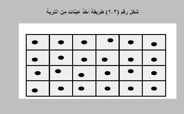 ب- عند دراسة العناصر المساحية مثل التربة أو النبات الطبيعي يتم تقسيم المنطقة إلى مربعات متساوية المساحة, ويجري اختيار نماذج مختلفة يمثل كل نموذج نوعا متميزا عن غيره, على سبيل المثال يوجد في منطقة الدراسة نباتات مختلفة في كثافتها. بعضها ذات كثافة عالية وأخرى متوسطة الكثافة وأخرى قليلة الكثافة, في مثل هذه الحالة يتم اختيار نماذج من المناطق الكثيفة وأخرى من المناطق المتوسطة والقليلة الكثافة , وكذلك الحال بالنسبة للتربة تحدد مواقع معينة يجري تحليل أفاق التربة فيها على أن تكون تلك العينات من كل أجزاء تلك المنطقة ,شكل رقم (3-2).