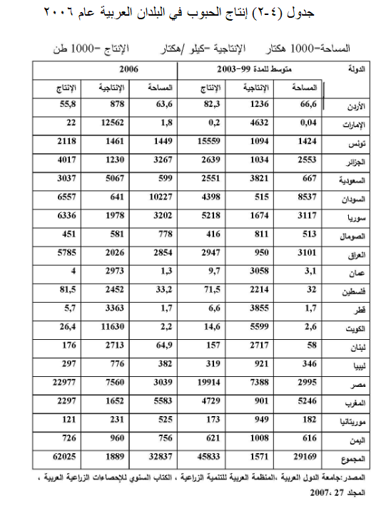 إن زيادة الإنتاج الزراعي يعتبر المدخل الرئيسي لتحقيق التنمية ويمكن تحقيق ذلك من خلال التوسع الراسي والتوسع الأفقي، ويمتاز الإنتاج الزراعي في الدول العربية بشكل عام بالتذبذب من سنة إلى أخرى وتباين كمية الإنتاج بين الدول العربية تبعا لتوفر الإمكانيات الطبيعية التي تتحكم بالاستثمار الزراعي. او من خلال تحليل الأرقام الواردة في الجدول الذي يمثل إنتاج الحبوب (القمح، والشعير، والذرة، والرز) في البلدان العربية، يتبين من خلال مقارنة متوسط النتاج الحبوب المدة 1999-2003 ومقارنتها مع الإنتاج عام 2006، يتبين إن هناك زيادة طرأت على الإنتاج، فقد كان متوسط الإنتاج من الحبوب 45833000 طن أصبح 62025000 طن عام 2006، وهذا يعطي مؤشر جيد على وجود توسع في زراعة الحبوب في الدول العربية بشكل عام بالرغم من تباين الإنتاج بين الدول العربية فالبلدان التي حققت زيادة في الإنتاج هي على سبيل المثال تونس ارتفع فيها الإنتاج من 1559 ألف طن إلى 2118 ألف طن ، والجزائر من 2639 إلى 4017 ألف طن وسوريا من 5218 ألف طن إلى 6336 ألف طن عام 2006 ، ومصر 19914 ألف طن إلى 22977 ألف طن ، بينما انخفض الإنتاج في بعض الدول العربية، فقد انخفض الإنتاج عند مقارنة متوسط الإنتاج للمدة 1999-2003 مع الإنتاج عام 2006 في كل من الأردن، وعمان ، وليبيا، وموريتانيا بنسبة تراوحت بين 10 - 15% .