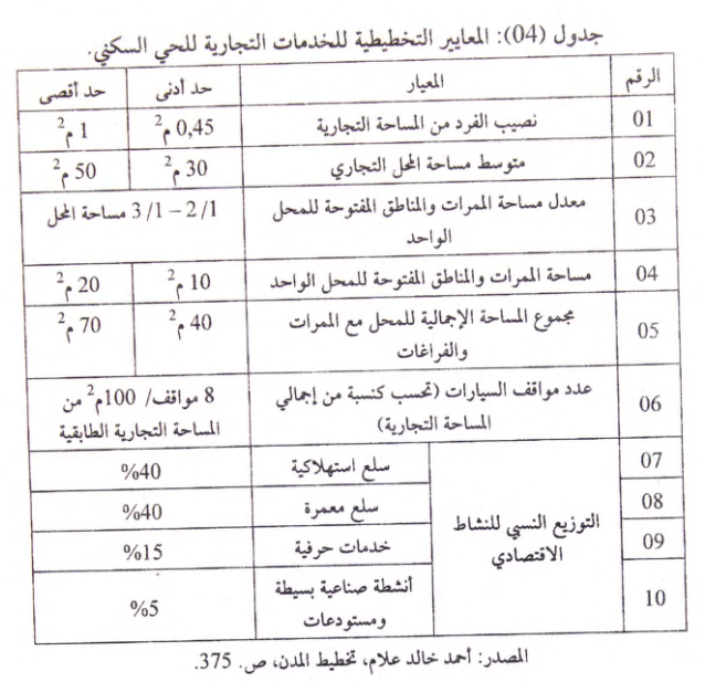 يتراوح عدد سكان الحي السكني بين 10.000 و 15.000 نسمة، ويقدر الحد الأدنى لمساحة المركز التجاري للحي السكني 4.500 م والحد الأقصى 15.000م، والجدول رقم 04 يوضح المعايير التخطيطية للخدمات التجارية في الحي السكني.