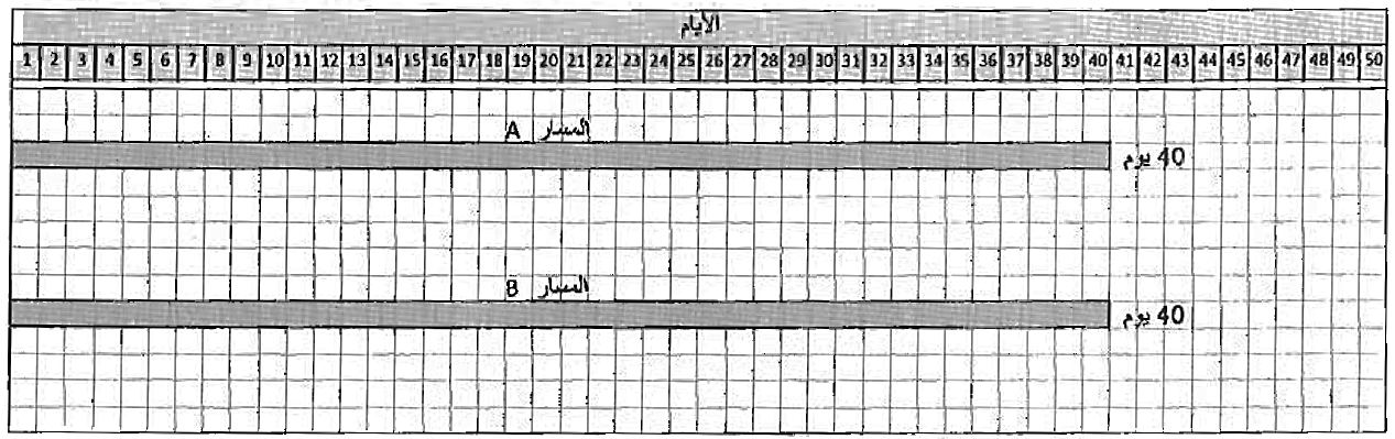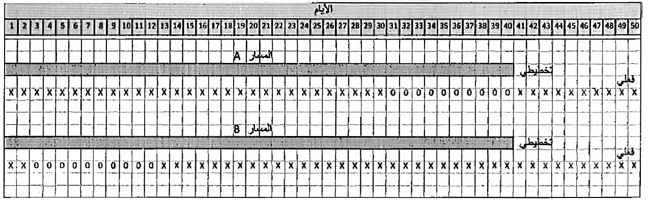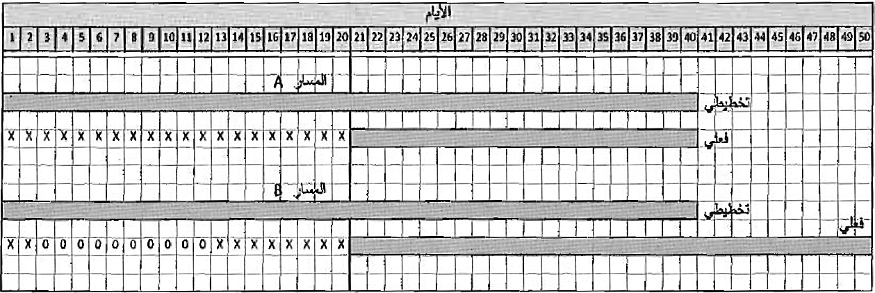 بالانتقال إلى اليوم الخمسين ، كما يظهر في الشكل (4). سنرى أن المسار B تابع التقدم وانتهى كما هو متوقع في نهاية اليوم الخمسين. بينما تأخر المسار A عشرة أيام من اليـوم 31 لغايـة اليـوم 40. وتـابع المسار A تقدمه إلى نهاية اليوم الخمسين. كما في التحليل السابق رأينا أن احتياطي المسار A قد ارتفع إلى 10 أيام. بالرغم من أنه تعرض لتأخير 10 أيام، إلا أنه لم يسبب تأخيراً لكامل المشروع. لقـد كـان المسار A هو الحرج فقط في اليومين الأول والثاني وبدأ يكتسب الاحتياطي ابتداء من اليـوم الثالث واستمر في الحصول على الاحتياطي حتى اليوم 41. ثم أصبح كلا المسارين حرجين بشكل متزامن من اليوم 41 إلى اليوم 50.