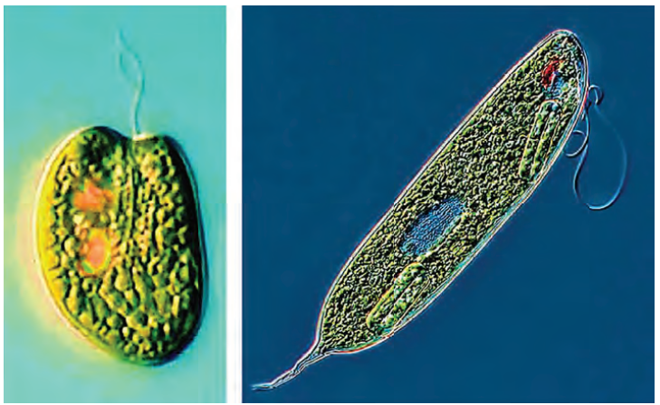 شكل 12-1: الكلاميدوموناس Chlamydomoas rheinhartii ( يسار) واليوغلينا Euglea gracilis (يمين). عن: (2016) Williams.