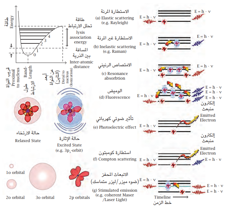 شكل 13-1: الطبيعة الكهرومغناطيسية للمادة وأنماط إثارتها الفردانية (يسار) الجزء العلوي يوضح مخطّط متطلبات طاقة الذرة الداخلية لتحفيز الإثارة حتى الوصول إلى التأين. الجزء السفلي يكشف عن مدارات الذرة القابلة للإثارة في ترتيبها المكاني. عن: (2015) Egot-Lemaire & Madl