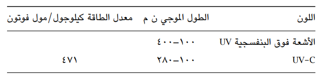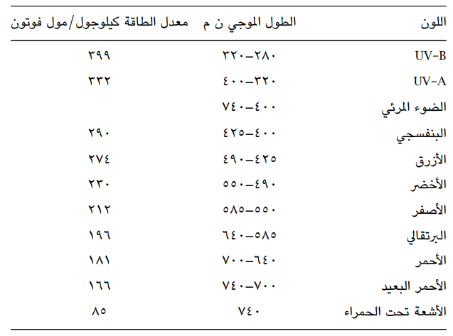 في الجدول 13-1: عرض للأطوال الموجية والطاقة لمكونات الضوء المرئي والأشعة فوق البنفسجية وتحت الحمراء.