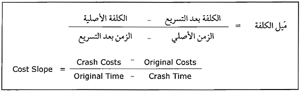 واحدة من الطرق المفضلة لتحديد أكثر الطرق فعالية لتسريع العمل بالنسبة للكلفة هي استخدام حساب ميل الكلفة Cost slope calculation ، وفق المعادلة التالية :