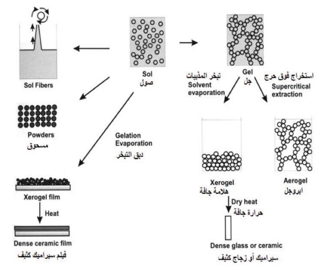 وهذه الطريقة تمر بطورين (انظر الشكل رقم 6) هما: طور السائل (sol)، ثم بعد فترة من الزمن تتبخر المادة، فتتحول إلى طور الجل (gel)؛ ولذلك سميت هذه الطريقة طريقة الصول - جل، وهذه الطريقة تستخدم في صنع قضبان ضوئية يمكن أن تكون وسطاً ليزريا. وقد صنعت قضبان ليزرية من مواد نانوية، ولكن الجزيئات غير مستقرة، وجاري البحث الآن في جعلها مستقرة (هذا الكلام يخص السيلكون نانو). كما تسمح هذه التقنيات بإنتاج مواد متناهية في الصغر، وذلك انطلاقاً من محاليل غروية. ومميزات هذه الطريقة تكمن في إمكانية التحكم في تجانس وهيكلة المادة في السلم النانومتري في المراحل الأولى للتحضير، وتوزيع الجزيئات. كما أنها تحضّر في درجة حرارة منخفضة بالمقارنة مع التقنيات الأخرى. وتسمح هذه التقنية أيضًا بتحضير قطع ضخمة، أو سطحية على ألواح، أو ألياف. كما تستعمل في صنع ألياف متعددة العناصر.