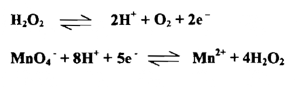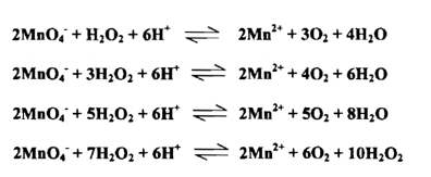 فإننا نستطيع أن نري حالاً 5 جزيئات فوق أكسيد الهيدروجين ستعطي 10 الكترونات والتي يأخذها أيونان من البرمنجنات ومن هذه النسبة يمكن موازنة المعادلة موازنة سهلة تامة وعامة أن وزن المعادلات التأكسدية - الاختزالية ينبغي أن تجري على وفق الخطوات الآتية :