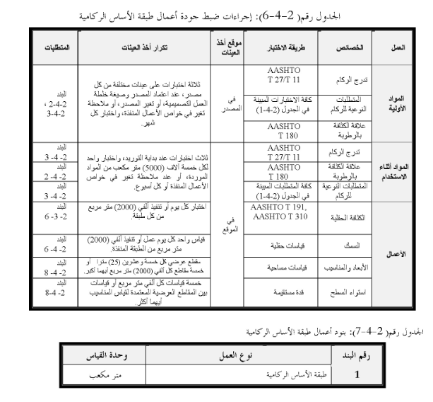 يجب ان يتم الدفع عن كميات الاعمال المنفذة فعلا والمقبولة فنيا ضمن الحدود والابعاد المعتمدة بموجب اسعار العقد او الاسعار المخفضة نتيجة اعمال تاكيد الجودة عندما تنص وثائق العقد على ذلك، تعد المبالغ المدفوعة عن استخراج ونقل وفرد وترطيب ودك المواد، بغض النظر عن مصدرها طبقا لهذه المواصفات العامة والمواصفات الخاصة ووثائق العقد الاخرى، وتوفير وتشغيل الاليات والمعدات والعمالة والاختبارات والقياسات وكل ما يلزم لتنفيذ الاعمال طبقا للمخططات والمواصفات الخاصة والعامة والرسوم والدفعات للغير. يكون الدفع بموجب البند المبين في الجدول رقم (2-4-7)، وبما لا يتعارض مع وثائق العقد . الجدول رقم (22-4-6): اجراءات ضبط جودة اعمال طبقة الاساس الركامية