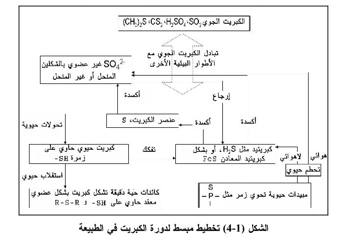 تعد دورة الكبريت الطبيعية، الممثلة بالشكل المبسط (1-4)، دورة معقدة نسبياً إذ يدخل الكبريت بعدة أشكال، بوصفه جزيئات غازيةً، أو أملاحاً قليلة الانحلال، أو شوارد منحلة في الأوساط المائية أو في التربة. ترتبط دورة الكبريت مع دورة الأوكسجين بشكل وثيق، حيث تؤدي تحولات مركبات الكبريت بجو يتوفر فيه الأكسجين الى تشكل الكبريت بأشكاله المتأكسدة مثل غاز ثاني أوكسيد الكبريت ، SO2، الملوث للجو وشاردة الكبريتات المنحلة 2- SO2 بالإضافة إلى حمض الكبريت H2SO4 الذي يعد من أهم مكونات الأمطار الحامضية. أما تحولات الكبريت في جو فقير بالأوكسجين فيعطي مركبات الكبريت بأشكالها المرجعة مثل غاز كبريت الهيدروجين، H2S ، وكبريتيد المعادن، مثل MS يدخل عنصر الكبريت في بنية المادة الحية ليعطي الشكل الحيوي كالبروتينات .