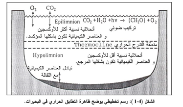 تتأثر نوعية الحياة والخواص الكيميائية بشكل كبير، بالخواص الفيزيائية للأوساط المائية. فأثناء تعاقب فصول السنة وكنتيجة للعلاقة الغريبة بين الكثافة ودرجة الحرارة في الأوساط المائية، تتشكل طبقات متمايزة في المياه الراكدة مثل البحيرات، الشكل (4-1). ففي فصل الصيف وبفعل الأشعة الشمسية تسخن الطبقة السطحية Epilimnion، وبسبب انخفاض كثافة هذه الطبقة الدافئة نسبياً، فإنها سوف تطفو فوق الطبقات السفلية Hypolimnion ، لتتشكل طبقات مائية غير ممتزجة، وتدعى حينها هذه الظاهرة بظاهرة التطابق الحراري.