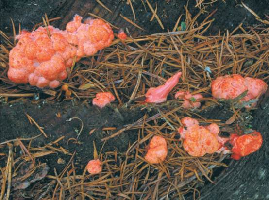 Pillows of the coral-colored slime mold Myxomycetes grow on damp wood.