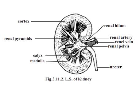Each kidney is enclosed by a fibrous connective tissue layer, called the renal capsule. Internally the kidney is divided into an outer cortex and an inner medulla. The medulla consists of several cone-shaped renal pyramids. Extensions of the pyramids called the medullary rays, project from the pyramids into the cortex. Extension of the cortex called renal columns, project between the pyramids. The tips of the pyramids are called the renal papillae. They are pointed toward the renal sinus. The renal papillae are surrounded by funnel shaped structures called the minor calyces. The minor calyces of several pyramids join together to form larger funnels called major calyces. There are 8-20 minor calyces and 2 or 3 major calyces per kidney. The major calyces converge to form an enlarged channel called the renal pelvis. The renal pelvis then narrows to form the ureter. The ureter leaves the kidney and gets connected to the urinary bladder.