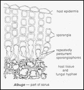 Otherwise known as a "white rust" (cause White rust of crucifers) which produces whitish coloured blisters on the surface of its host. These blisters contain innumerable unicellular mitosporangia (sporangia that produce spores by mitosis) that develop in chains from the tips of short tightly packed sporangiophores . When the host epidermis bursts, the sporangia are wind- or rainsplash-dispersed to other host plants, where each can germinate to release eight biflagellate zoospores. Oogonia develop later, inside the host stem or leaves, and sexual reproduction is usually heterothallic.