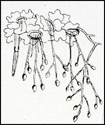 The fungus causing downy mildew in crucifers. the sporangiophores cover the surface of the leaves and stems of the infected plants, giving them a "downy" appearance.( the parasitized cells are not killed) . after few days of vegetative activity within the host, reproductive structures are formed. These are branched sporangiophore ,each emerges through a stoma and has an un branched lower region and a branched upper one with fine ends each bearing an oval sporangium.