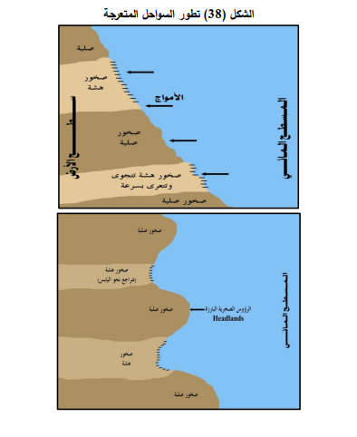 1. السواحل المتعرجة تتطور في المناطق الساحلية المتكونة من صخور متباينة في درجة صلابتها يترتب عليها تباين في درجة استجابتها لعمليات التعرية الموجبة، فتتراجع الصخور الهشة إلى الوراء على حساب اليابس وتبقى الصخور الصلبة مقاومة أمام التعرية الموجية بشكل بروزات صخرية تمتد في المسطح المائي ليتطور عن السواحل المتعرجة وكذلك تسمى الرؤوس البحرية Head lands).)