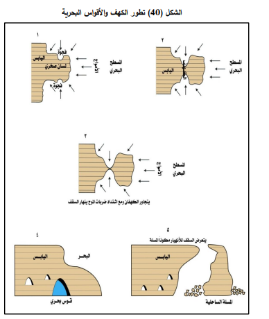 3. الكهوف البحرية شروط تطورها أن تكون صخور الساحل غنية بالفواصل أسطح التطبيق وتتواجد ضمن مستويات المد والجزر على الأغلب بتقدم موجات المد العالية وبسرعات متباينة تصل إلى 80 كم / ساعة يوفر لها طاقة آلية مرتفعة تولد ضغطاً كبيراً على صخور الساحل ويزداد هذا الضغط بازدياد الحمولة الإرسابية للأمواج إذ تصل إلى 4000 كغم / قدم). وباستمرار غمر الصخور بموجات المد يومياً تمتلئ مظاهر الضعف الصخري بالمياه ضاغطة الهواء المتواجد فيها وبتراجع موجات المد يعود الهواء إلى التمدد المفاجئ بقوة تفجيرية مؤدياً إلى تكوين في البدء فجوات وهذه تكبر وتلتحم مع بعضها لتكون الكهوف الذي يكون بشكل نفق اسطواني يمتد في صخور الساحل على طول مناطق الضعف الصخري وتكون الفتحة المواجهة للبحر أوسع ما في الكهوف حيث تضيق باتجاه العمق، وباستمرار عمليات الضغط الموجي ينهار سقف الكهف ليتحول إلى (شرم بحري) ضيق ذات جوانب شديدة الانحدار مرتفعة لتكون فيما بعد بمثابة خلجان ضيقة وقصيرة.