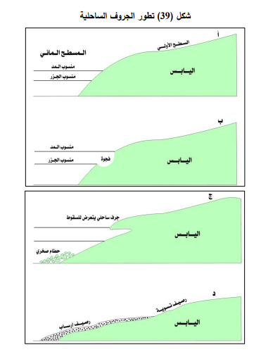 جميع المظاهر الآنفة الذكر تتطور بفعل العمليات الهدميه التفاضلية للأمواج في صخور الساحل وتكون كالآتي: