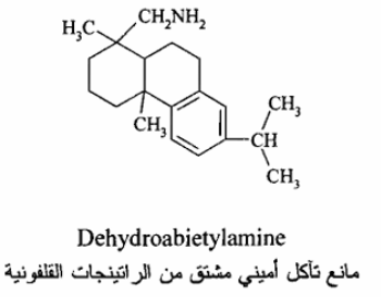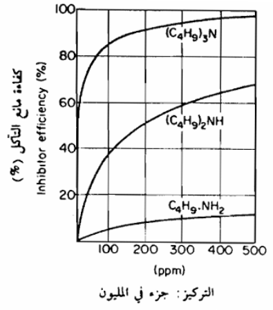 كما تستخدم نترات الصوديوم القاعدية لوحدها أو مع موانع لا عضوية أخرى كالفوسفات لحماية خطوط الأنابيب وناقلات المشتقات النفطية والكيميائية كذلك مادة بنزوات الصوديوم تستخدم لحمايته الفولاذ الطري أيضاً فإن الجير المطفأ 2(Ca (OH يعمل كمانع للتآكل بتأثيره على القطب السالب بواسطة ترسيب كربونات الصوديوم من المياه التي تحوي على العسرة المؤقتة أو ثاني أكسيد الكربون الذائب فالدقائق الغروانية لكربونات الصوديوم تكون فيها شحنة موجبة تؤدي إلى انجذابها إلى مناطق القطب السالب حيث ترسبها يوقف أو يقلل التآكل. إن موانع التآكل العضوية تعمل بطرق عديدة ومختلفة، فالمواد الغراونية العضوية تكون طبقات واقية نتيجة التصاقها بسطح المعدن المواد الكيميائية ذات الفعالية السطحية Surface-Active Chemicals)) التي تحتوى على مجاميع قطبية تعزز الانتشار والالتصاق المناسب بالسطح المعدني (وهى غير متأينة) ولكنها تكون غطاء على سطح المعدن القواعد العضوية مثل الأمينات (Amines) والبريدين (Pyridine) والكوالينين (Quinoline) ومشتقاتها تكون أيونات موجبة تحتوى على مجاميع وجذور ذات طبيعة طاردة للماء Hydrophobic)) وأن هذه الأيونات الموجبة تربط نفسها من خلال ذرة النيتروجين إلى المناطق السالبة لسطح المعدن ولقد وجد أن كفاءة هذه الموانع يعتمد على عدد ومعيار الجذور الهيدروكربونية فالأمينات الأميلي الأولية (C5H11NH2) هي أفضل كمانعات للتآكل من الأمينات الأثيلي الأولية (C2H5NH2) فالزيادة في حماية المعدن التي يمكن الحصول عليها سبب زيادة عدد جذور الاكالي Alky (Radicals) موضحة في الشكل التالي ، حيث أن أجزاء قليلة في المليون من الأمينات الثلاثية تكفى للحصول على حماية تامة الأمينات ذات الأوزان الجزيئية العالية والمشتقة من الراتينج القلفونية (Rosin) كما موضح في الشكل التالي هي موانع جيدة للتآكل