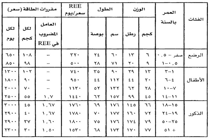 جدول رقم (4ــ2): متوسط الأطوال والأوزان وكمية الطاقة الموصى بها
