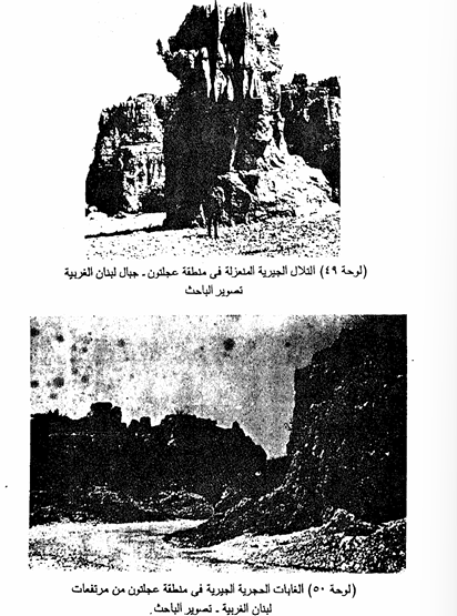 وعندما تتكون مجموعات متجاورة من التلال الصخرية الجيرية (تبعا لتعرض الحافات الجيرية لفعل التجوية الكيميائية الشديد) تظهر التلال على شكل ما يشبه الغابات أو جذوع أشجار حجرية عالية ، ومن ثم يطلق عليها تعبير الغابات الحجرية Stone Forests . وقد درس الباحث هذه الظاهرة الجيومورفولوجية في منطقة عجلتون وفيترون بحوض نهر الكلب ، في الأراضي اللبنانية ، وقد تبين أن كل أسطح التلال الصخرية المنعزلة ، وكذلك تلك التى تتكون في مجموعات تلال الغابات الحجرية مشكلة بحفر إذابة عميقة ذات أشكال مختلفة niches تزيد من شدة وعورة وتضرس المناطق الجيرية ، ويعزى تكوين هذه الحفر إلى فعل الاذابة في الصخور الجيرية.