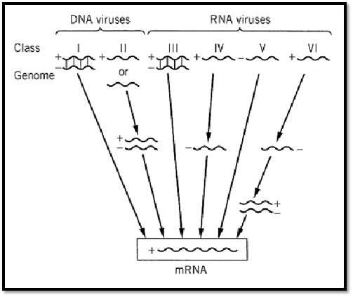 Figure 2. Baltimore's simplified classification of viruses. This classification is based on the type of nucleic acid in the genome and the mode of production of mRNA (3). Class I: Viruses with a ds DNA genome; mRNA is transcribed by the classical mechanism of transcription of a ds DNA template. Class II: Viruses with a ss DNA genome; the DNA strand has the same, positive sense as the mRNA, or else the sense of the genomic strand is negative, opposite to the mRNA. Synthesis of viral mRNA does not proceed before the ss DNA genomes of class II viruses are converted to a ds molecule. Class III: Viruses with ds RNA genome; such genomes are segmented. Transcription of mRNA is catalyzed by an RNA-dependent RNA polymerase packaged in the virion. Class IV: Viruses with an ss RNA genome of the same polarity as mRNA; an ss RNA (–) template is made before mRNA synthesis. Class V: Viruses with an ss RNA (–) genome complementary to the mRNA. Virion RNA is transcribed into mRNA by virion-associated enzymes. Class VI: Retroviruses have a diploid RNA genome made of two molecules of RNA (+). The + sense RNA is used as template by reverse transcriptase for the synthesis of a ds provirus to be integrated in the host DNA; transcription is catalyzed by a cellular DNA-dependent RNA polymerase .