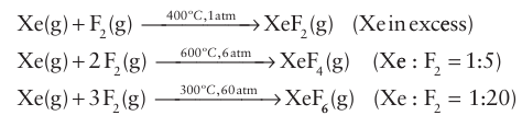 The xenon fluorides are synthesized by direct reaction of the ele ments, usually in a nickel reaction vessel that has been passivated by exposure to F2 to form a thin protective NiF2 coating. This treatment also removes surface oxide, which would react with the xenon fluorides. The synthetic conditions indicated in the follow ing equations show that formation of the higher halides is favoured by a higher proportion of fluorine and higher total pressure:
