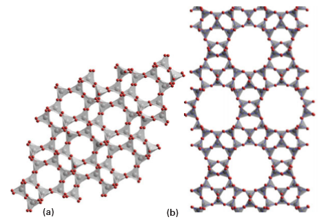 Figure 24.51 The frameworks, formed from linked oxotetrahedra, of (a) DAF and (b) CIT. In each case the main channels present are emphasized by viewing the structure along them. methanol into hydrocarbons selectively, although the aluminosilicate zeolites, particularly ZSM-5, remain the best materials for this application (Section 26.14). The incorporation of Co and Mn, both of which have redox properties, into ALPO frameworks yields materials that can be used for the oxidation of alkanes.