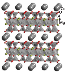 Figure 24.53 Sheet-like structures of the clay hectorite which consist of layers of linked octahedra and tetrahedra centred on, typically, Al, Si, or Mg and separated by cations such as Kor Cs+.