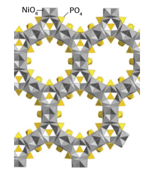 Figure 24.56 The framework structure of VSB-1 consists of linked NiO6 octahedra and PO4 tetrahedra. The main channel is bounded by 24 such units and has a diameter such that molecules up to 0.88 nm in diameter may pass through it.