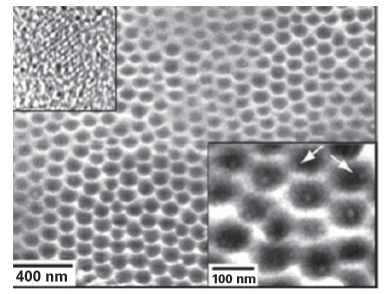 Figure 25.8 An SEM image of an array of nanoscale wells that contain one CdS nanocrystal per well. The lower inset magnifies a small area of the array; the white arrows indicate crystals formed at the edges of the wells. The upper inset is a TEM image of an individual CdS nanocrystal removed from the array of nanowells by sonication. (J.E. Barton and T.W. Odom, Nano Lett., 2004, 4, 1525.)