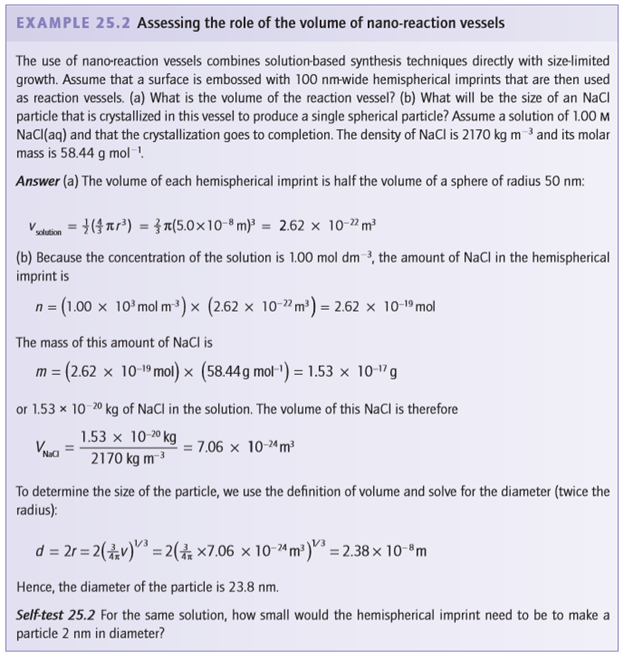 Key points: By carrying out reactions in nanoscale reaction vessels, the ultimate dimensions of solid products are confined to the vessel size; a reverse micelle has an aqueous core in which reactions can occur. When the synthesis of a particle is carried out in a nano-vessel, the ultimate particle size is limited by the vessel size. One popular route is the inverse micelle synthesis approach. An inverse micelle consists of a two-phase dispersion of immiscible liquids, such as water and a nonpolar oil. By including amphipathic surfactant molecules (molecules having a polar and a nonpolar end), the aqueous phase can be stabilized as dispersed spheres with a size dictated by the water: surfactant ratio (Fig. 25.7). The size of the crystalline particles is limited by the micelle volume, which can be controlled on the nanoscale. Examples of nanoparticles formed by this technique are Cu, Fe, Au, Co, CdS, CdSe, ZrO2, ferrites, and core–shell particles such as Fe/Au. An alternative approach to nanopatterning is laser-assisted embossing, which has been used to generate close-packed arrays of hemispherical nanowells having volumes of the order of zeptolitres (1 zL=10-21 L= 10-25 m3= 103 nm3). The volumes of the nanowells are manipulated by changing the intensity of the laser, by altering the pressure between the mould and the substrate, and by growing an amorphous oxide on the patterned silicon prior to nanocrystallization. Nanowells with diameters as small as 50 nm have been used as reaction chambers for the preparation of semiconducting nanocrystals. Under most growth conditions, independent nanocrystals are formed in individual nanowells (Fig. 25.8).