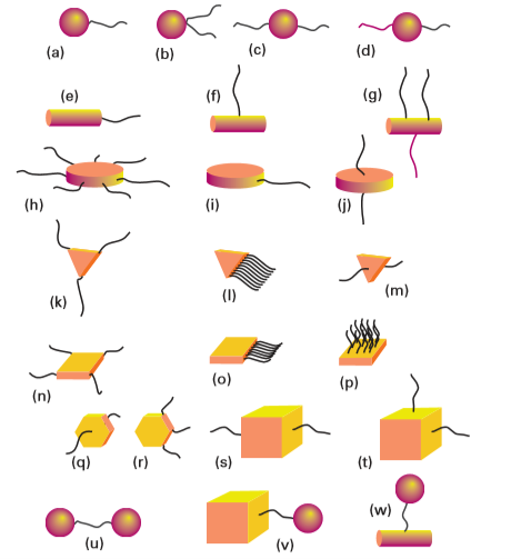 Figure 25.14 Representative tethered nanobuilding blocks: (a–d) tethered nanospheres; (e–g) tethered nanorods; (h–p) tethered nanoplates, including circular, triangular, and rectangular plates; (q, r) tethered nanowheels; (s, t) tethered nanocubes; (u–w) triblock nanobuilding blocks created by joining two nanoobjects with a polymer tether. (Adapted from Z. Zhang, et al., Nano Lett., 2003, 3, 1341.)