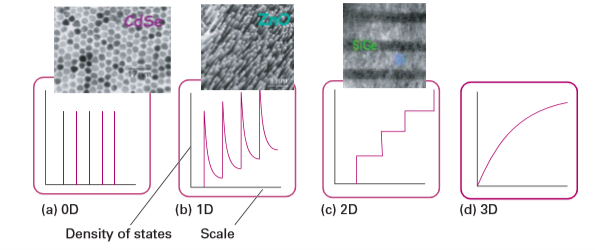Figure 25.15 Effects of confinement of charge carriers on the density of states for nanomaterials with specific dimensionality. (Adapted from A. Mrumjadar, Nonoscience Boot Camp at Northwestern University 2001.) Specific tethering groups influence the nature of the self-assembly of the nanobuilding blocks into larger ordered nanostructures. Control over dimensionality in materials can yield unique control over their physical properties. For example, dimensionality has a noted influence on the density of electronic states (Fig. 25.15). In the next few sections we examine specific examples of how that control has been achieved and the novel properties that have been reported.