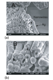 Figure 25.20 (a) Low-magnification and (b) high-magnification SEM images of Au/TiO2 core–sheath nanowire arrays. (Y.-G. Guo, et al., J. Phys. Chem. B, 2003, 107, 5441.) An advantage of the layer-by-layer nanowire-templating approach over other methods is that nanoscale control can be exerted over the sheath thickness by varying the number of deposition cycles. Titanium dioxide has been one of the most investigated oxide materials because of its technological importance. It has been widely used for photocatalysis and environmental clean-up applications, on account of its strong oxidizing power, chemical inertness, and nontoxicity. These core–sheath nanowires have well-defined diameters and lengths, largely determined by the dimensions of the templates, and porous sheaths with thicknesses controlled by the number of layers deposited. This method opens a door to the use of a wide variety of nanowires as the positive templates for the fabrication of core–sheath nanostructured materials for chemical sensors, photocatalysis, light energy conversion devices, and nanoscale electronic and optoelectronic devices. More specifically, Au and Ag nanowires have been targeted as scaffolds for optical sensing of environmentally and biologically important analytes with very high selectivity and sensitivity.