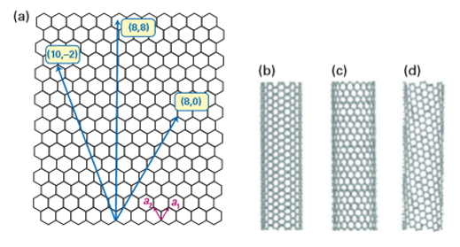 Figure 25.17 (a) The honeycomb structure of a graphene sheet. Single-walled carbon nanotubes can be formed by folding the sheet along lattice vectors, two of which are shown as a1 and a2. Folding along the (8,8), (8,0), and (10,–2) vectors leads to armchair (b), zigzag (c), and chiral (d) tubes, respectively. (Based on H. Dai, Acc. Chem. Res., 2002, 35, 1035.) (Reproduced with permission from the American Chemical Society.)