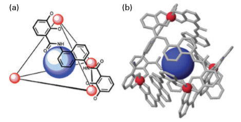 Key points: Metal–organic polyhedra and frameworks offer tunable catalytic surfaces and high surface areas; they are assembled using supramolecular chemistry. A second class of three-dimensionally controlled nanostructures is metal–organic frameworks (MOFs). These frameworks are self-assembled from a careful choice of metal ions, bridging organic ligands, and/or metal–organic polyhedra (MOP). They offer an alternative approach to the synthesis of open porous materials using supramolecular assembly and are being called the ‘new zeolites’. These macroscopic materials have some of the highest reported surface areas and, as such, have found practical application for methane and hydrogen storage, catalysis, and drug delivery. As discussed earlier, supramolecular chemistry relies on bridging together nanobuilding blocks (NBBs) to assemble macroscopic materials. One new strategy in design is the incorporation of nanoporosity (pores with dimensions of 1 to 100 nm) within the NBB or MOP. The synthesis of a nanoporous cuboctahedron NBB (Fig. 25.30a) was achieved by linking rigid square molecules of Cu2(CO2)4 with m-BDC (1,3-benzenedicarboxylate). The overall NBB formula is Cu25(m-BDC)24(DMF)14(H2O)10(H2O)50(DMF)6 (C2H5OH)6 and is termed more conveniently MOP-1. This compound is constructed from 12 paddle-wheel units (themselves NBBs) bridged by m-BDC to yield a large metal-carboxylate polyhedron. The simplest way to view the overall structure is by considering its relationship to the cuboctahedron (shown in Fig. 25.13), where each square and link has been replaced by the paddle-wheel NBB and the m-BDC (two-connector) units, respectively, to give an expanded-augmented cuboctahedron (or a truncated cuboctahedron). The ability to synthsize the cuboctahedron illustrates the feasibility of obtaining crystals of large porous metal–organic polyhedra in which rigid NBBs are an integral part of a well-defined structure. More recently, a zeolitic imidazolate framework compound, ZIF-69, has been reported that can store 83 dm3 of carbon dioxide perlitre (1 dm3) of material at 0°C and 1 atm. MOPs have also been designed for selective catalysis that mimic active sites in enzymes. Enzymatic catalysis often relies on the highly constrained environment of substrates within the active site. Recent examples in supramolecular organometallic chemistry mimic this approach by using host–guest interactions. A supramolecular M4L6 tetrahedral assembly has been developed to provide a host that mediates a variety of organic and organometallic transformations, including the isomerization of allylic alcohols. The M4L612- host is formed from the self-assembly of four octahedral metal centres (M Fe (III) or Ga(III)) at the vertices and six bis-catecholamide naphthalene ligands (L4-) that span the edges of a tetrahedron (Fig. 25.30b). The host has been found to encapsulate monocationic guests