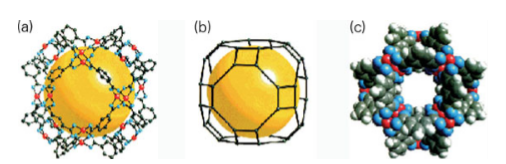 Figure 25.30a The crystal structure of MOP-1 (drawn using coordinates obtained for c-MOP-1) showing (a) 12 paddle-wheel units (Cu, red; O, blue; C, grey) linked by m-BDC to form (b) a large truncated cuboctahedron of 1.5 nm diameter void (yellow sphere); the grey spheres (carbon atoms) represent the polyhedron constructed by linking together only the carboxylate C atoms in (a) to form linked square NBBs, an arrangement that provides for (c) a large porous polyhedron with triangular and square windows. Hydrogen atoms in light grey; otherwise, same colouring scheme as in (a). (M. Eddaoudi, et al., J. Am. Chem. Soc., 2001, 123, 4368.) (Reproduced with permission from the American Chemical Society.)