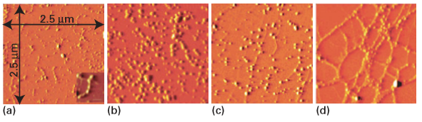 Figure 25.37 AFM images of complexes of lysine-modified gold nanoparticles and DNA at different nanoparticle/DNA ratios (a) 10:1, (b) 20:1, (c) 50:1, and (d) 100:1. Several wrapped molecules are seen along with free nanoparticles in (a) and (b). Network formation is seen in (c) and (d). The inset in (a) shows a single DNA molecule wrapping around six nanoparticles. (Reproduced by permission from M. Ganguli, et al., Langmuir, 2004, 20, 5165.)