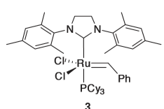 In the case of Grubbs’ catalyst, it is known that the dissociation of a PCy3 ligand from the Ru metal centre is crucial in allowing the alkene molecule to coordinate prior to metallacyclobutane formation. The identification of this mechanism led Grubbs to replace one of the PCy3 ligands with a bis(mesityl) N-heterocyclic carbene (NHC) ligand, reasoning that the stronger σ-donor and poorer π-acceptor ability of the NHC ligand would both encourage PCy3 dissociation and stabilize the alkene complex. In a triumph of rational design, the so-called second-generation Grubbs’ catalyst (3) proved to be more active than the original bisphosphine complex. The second-generation Grubbs’ catalyst is active in the presence of a large number of different functional groups on substrates and can be used in many solvent systems. It is commercially available and has been widely used, including in the total synthesis of a number of natural products. The driving force for alkene metathesis reactions varies. For ROM and ROMP (see Table 26.2) it is the release of ring strain from a strained starting material that provides the energy to drive the reaction. For metathesis reactions that result in the generation of ethene (such as RCM or CM) it is the removal of the liberated ethene that can be used to encourage the formation of the desired products. Where there is no clearly identifiable thermodynamically favourable product possible, mixtures of alkenes result, with their relative proportions being determined by the statistical likelihood of their formation.