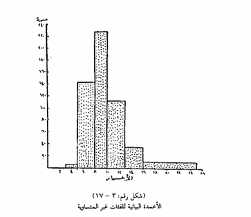 وعند توقيع البيانات على الرسم يجب مراعاة أن يكون المحور الأفقي الذي تمثل عليه الفئات خاضعاً لنفس الأساس بأن تشغل قاعدة كل عمود عدداً من السنوات يتناسب مع طول فئة السن المطلوب تمثيلها. والشكل رقم (3-17) يوضح مثل هذه الطريقة، فهو يبين أعمدة بيانية لفئات غير متساوية حيث يبدو انساع كل عمود مخالفاً لاتساع الأعمدة الأخرى حسب طول فئات السن المختلفة.