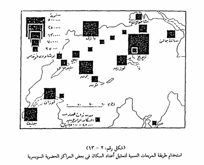 وينطبق كل ما ذكرناه من خصائص الاستخدام للدوائرالنسبية على المربعات النسبية، فكلاهما صالح لنفس الاستخدام ولنفس ما نريد تمثيله على خرائط التوزيعات السكانية، إلا أن خرائط التوزيعات بالدوائر النسبية أكثر انتشاراً نظراً لأنه الإمكان تقسيمها داخلياً على أساس أن المساحة الكلية للدوائر (360) تمثل من مجموع الظاهرة مجموع السكان في المنطقة أو الاقليم، بينما يكون التقسيم الداخلى وفق التركيب الوظيفي أو العمري.