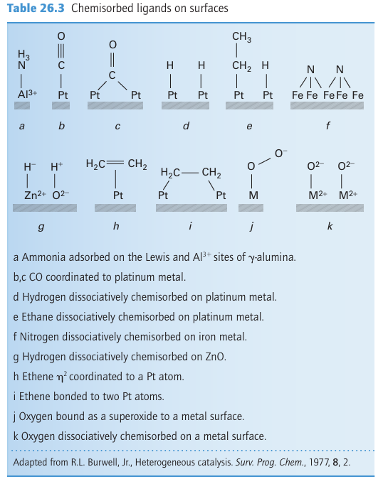 Key points: Very small metal particles on ceramic oxide substrates are very active catalysts for a range of reactions. Metal particles are often deposited on supports to provide a catalyst. For example, finely divided Pt/Re alloys distributed on the surface of γ-alumina particles are used to inter convert hydrocarbons, and finely divided Pt/Rh rhodium alloy particles supported on γ-alumina are used in the catalytic converters of vehicles to promote the combination of O2 with CO and hydrocarbons to form CO2 and reduction of nitrogen oxides to nitrogen (Box 26.1). A supported metal particle about 2.5 nm in diameter has about 40 per cent of its atoms on the surface, and the particles are protected from fusing together into bulk metal by their separation. The high proportion of exposed atoms is a great advantage for these small supported particles, particularly for metals such as platinum and the even more expensive rhodium. The metal atoms on the surface of metal clusters are capable of forming bonds such as M-CO, M-CH2R, M-H, and M-O (Table 26.3). Often the nature of surface ligands is inferred by comparison of IR spectra with those of organometallic or inorganic complexes. Thus, both terminal and bridging CO groups can be identified on surfaces by IR spectroscopy, and the IR spectra of many hydrocarbon ligands on surfaces are similar to those of discrete organometallic complexes. The case of the N2 ligand is an interesting contrast because coordinated N2 was identified by IR spectroscopy on metal surfaces before dinitrogen complexes had been prepared.