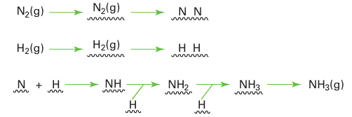 Key point: Catalysts based on iron metal are used for the synthesis of ammonia from nitrogen and hydrogen. The synthesis of ammonia has already been discussed from several different viewpoints (Section 15.6). Here we concentrate on details of the catalytic steps. The formation of ammoniais exergonic and exothermic at 25°C, the relevant thermodynamic data being ∆fGO 116.5 kJ mol 1, ∆fHO 146.1 kJ mol 1, and ∆f SO 199.4 J K1 mol 1. The negative entropy of formation reflects the fact that two NH3 molecules form in place of four reactant molecules. The great inertness of N2 (and to a lesser extent H2) requires that a catalyst be used for the reaction. Iron metal, together with small quantities of alumina and potassium salts and other promoters, is used as the catalyst. Extensive studies on the mechanism of ammonia synthesis indicate that the rate-determining step under normal operating conditions is the dissociation of N2 coordinated to the catalyst surface. The other reactant, H2, undergoes much more facile dissociation on the metal surface and a series of insertion reactions between adsorbed species leads to the production of NH3: