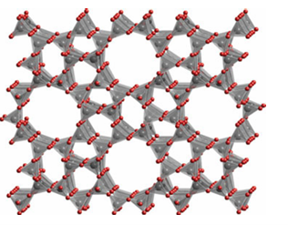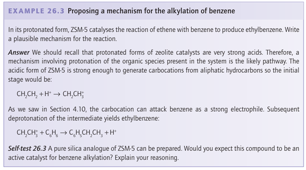 Key points: Zeolite catalysts have strongly acidic sites that promote reactions such as isomerization via carbonium ions; shape selectivity may arise at various stages of the reaction due to the relative dimensions of the zeolite channels and reactant, intermediate, and product molecules. The zeolite-based (Sections 14.15 and 24.12) heterogeneous catalysts play an important role in the interconversion of hydrocarbons and the alkylation of aromatics as well as in oxidation and reduction. Two important zeolites used for such reactions are faujasite (Fig 26.22), also known as zeolite X or zeolite Y (the X or Y terminology is defined by the Si:Al ratio of the material, X has a higher Al content) and zeolite ZSM-5, an aluminosilicate