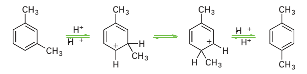 Acidic zeolite catalysts also promote rearrangement reactions via carbonium ions. For ex ample, the isomerization of 1,3-dimethylbenzene to 1,4-dimethylbenzene probably occurs by the following steps: