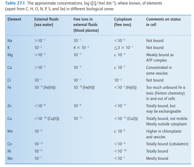 Key points: The major biological elements are oxygen, hydrogen, carbon, nitrogen, phosphorus, sulfur, sodium, magnesium, calcium, and potassium. The trace elements include many d metals, as well as selenium, iodine, silicon, and boron. Table 27.1 lists many of the elements known to be used in living systems, although not ne cessarily by higher life forms. All the second- and third-period elements except Be, Al, and the noble gases are used, as are most of the 3d elements, whereas Cd, Br, I, Mo, and W are the only heavier elements so far confirmed to have a biological function. Several others, such as Li, Ga, Tc, Ru, Gd, Pt, and Au, have important and increasingly well-understood applications in medicine. The biologically essential elements can be classified as either ‘major’or ‘trace’. Although a good idea of the biological abundances of different elements is given in Table 27.1, the levels vary considerably among organisms and different components of organisms. For example, Ca has little role in microorganisms but is abundant in higher life forms, whereas the use of Co by higher organisms depends on it being incorporated into a special co factor (cobalamin) by microorganisms. There is probably a universal requirement for K, Mg, Fe, and Mo. Vanadium is used by lower animals and plants as well as some bacteria. Nickel is essential for most microorganisms, and is used by plants, but there is no evidence for any direct role in animals. Nature’s use of different elements is largely based on their availability. For example, Zn has widespread use (and, together with Fe, ranks among the