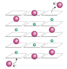 Figure 27.5 Mechanism of transport of K ions through the selectivity filter of the K channel. Green spheres represent water molecules.