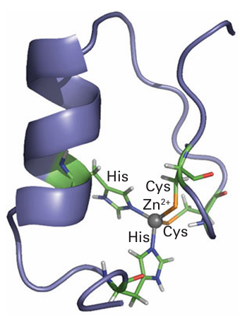 Figure 27.9 Zinc fingers are protein folds that form a sequence able to bind to DNA. A typical finger is formed by the coordination of Zn (II) to two pairs of amino acid side chains located either side of the ‘fingertip’.