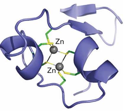 where the amino acid X is variable. Aside from the ‘classical’ (Cys)2 (His)2 zinc finger, others have been discovered that have (Cys)3 His or (Cys)4 coordination, together with more elaborate examples having ‘Zn-thiolate clusters’, such as the so-called GAL4 transcription factor in which two Zn atoms are linked by bridging cysteine-S ligands (16). Various protein folds are produced, with faintly jocular names, such as ‘zinc knuckles’, joining an