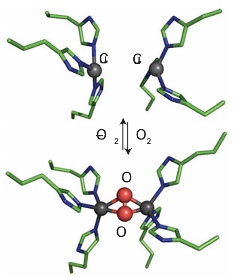 Key point: Arthropods and molluscs use haemocyanin and certain marine worms use haemerythrin. In many organisms, such as arthropods and molluscs, O2 is transported by the Cu protein haemocyanin, which, unlike haemoglobin, is extracellular, as is common for Cu proteins. Haemocyanin is oligomeric, with each monomer containing a pair of Cu atoms in close proximity. Deoxyhaemocyanin (Cu(I)) is colourless but it becomes bright blue when O2 binds. The active site is shown in Fig. 27.19. In the deoxy state, each Cu atom is three-coordinate and bound in a pyramidal array by three histidine residues. The two Cu atoms are so far apart (460 pm) that there is no direct interaction between them. The low coordination number is typical of Cu(I), which is normally two- to four-coordinate. Rapid and reversible coordination of O2 occurs between the two Cu atoms in a bridging dihapto manner (μ-2 2) and the low vibrational wavenumber of the coordinated O2 molecule (750 cm1) shows it has been reduced to peroxide O2-2, with an accompanying lowering of the bond order from 2 to 1. To accommodate the binding of O2, the protein adjusts its conformation to bring the two Cu atoms closer together. The Cu sites become five-coordinate, which is typical of Cu (II). Haemerythrin is an example of a special class of dinuclear Fe centres that are found in a number of proteins with diverse functions, such as methane monooxygenase, and some ribonucleotide reductases and acid phosphatases. The two Fe atoms in the active site of haemerythrin (21) are each coordinated by amino acid side chains but are also linked by two bridging carboxylate groups and a small ligand. In the reduced form, which binds O2 reversibly, this small ligand is an OH- ion. Coordination of O2 occurs at only one of the Fe atoms and the distal O atom forms a hydrogen bond to the H atom of the bridging hydroxide.